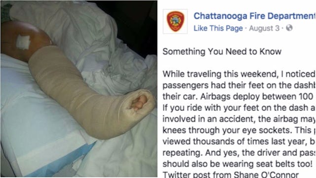 “While traveling this weekend, I noticed many passengers had their feet on the dashboard of their car,” the poster writes. “Airbags deploy between 100 and 220 MPH. If you ride with your feet on the dash and you’re involved in an accident, the airbag may send your knees through your eye sockets.”