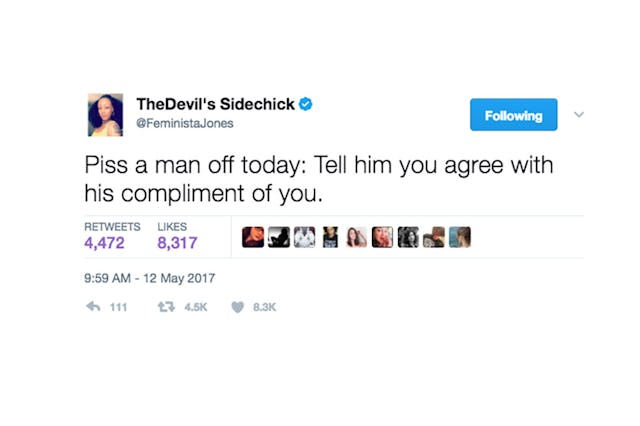 “Piss a man off today,” she tweeted. “Tell him you agree with his compliment of you.”
