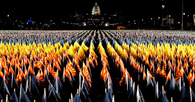 WASHINGTON, DC – JANUARY 18: The “Field of Flags” is illuminated on the National Mall as the U.S Capitol Building is prepared for the inauguration ceremonies for President-elect Joe Biden on January 18, 2021 in Washington, DC. Approximately 191,500 U.S. flags will cover part of the National Mall and will represent the American people who are unable to travel to Washington, DC for the inauguration. (Photo by Joe Raedle/Getty Images)