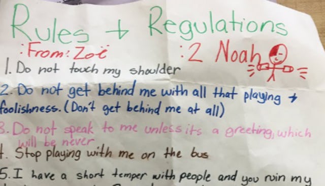 Fifth grade girl writes epic list of rules for boy annoying her at school