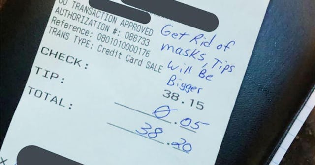 File this under: Don’t be this guy. A man in Lincoln, Nebraska left his server a five-cent tip on a $38 meal, because he was mad that he had to wear a mask to enter the restaurant. Ali Siverhus, who works at Big Red East in Lincoln, Nebraska — which has a city-wide mask mandate — shared a photo of the crappy tip she received which included a hand-written message to “get rid of masks, tips will be bigger.”
