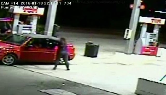In surveillance video from the gas station, the woman can be seen yanking open the driver’s side door, hitting the man, pulling off his mask, and dragging him out of the car. The two men then run away like a couple of scared kittens, and the woman straightens her clothes and returns to finish pumping her gas.