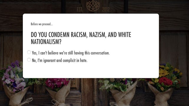 On Monday, the Chicago and Milwaukee-based florist, Flowers For Dreams, added a pop-up to its website that asks, “Do you condemn racism, nazism and white nationalism?” Visitors have one of two options to proceed into the website: (1) click “Yes, I can’t believe we’re still having this conversation; or (2) clicking “No, I’m ignorant and complicit in hate.”