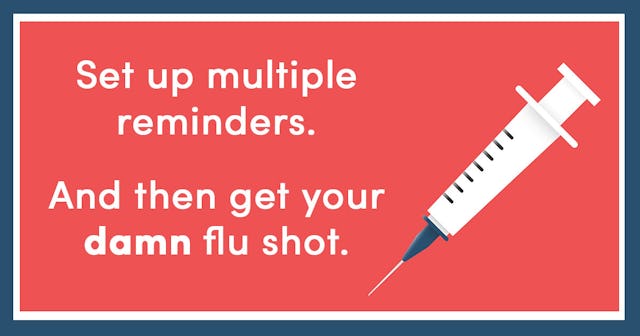 But this is not the year to let the flu shot fall off your to-do list. Make a plan. Write that shit on your calendar. Set up multiple reminders. And then get your damn flu shot. Get your Covid vaccine while you’re at it.