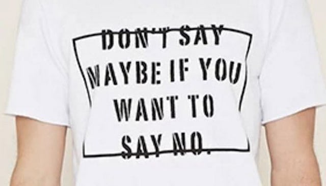 The latest “what were they thinking” piece of clothing is a new victim-blaming shirt for men from Forever 21 that will make you scream “ughhh.” The white graphic tee reads, “Don’t Say Maybe If You Want To Say No.”
