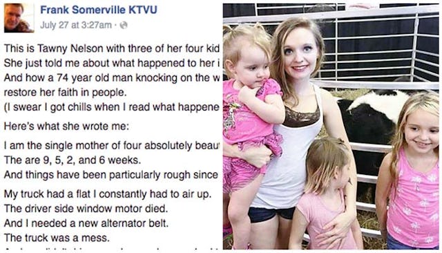 And they did. The following morning the man returned to Nelson’s house with a mechanic who repaired her car battery and alternator. The man left before the mechanic was finished but when Nelson went to pay the mechanic he told her the man had taken care of it and said, “The only payment the older man wanted was for me to never give up and keep being an amazing mom.” We might never know who this man is, but he’s obviously a saint of some sort.
