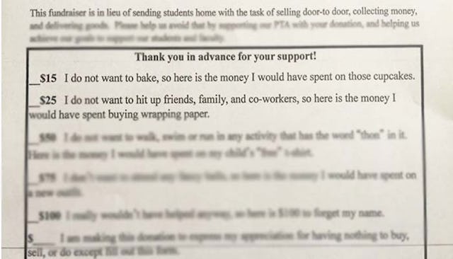 One PTA thought of a way to avoid it all – and it’s brilliant. Take a look at this donation form sent home to parents of children at one Rockland, Texas school that mom Dee Wise Heinz shared last year. It’s going viral again because — well, you’ll understand why.