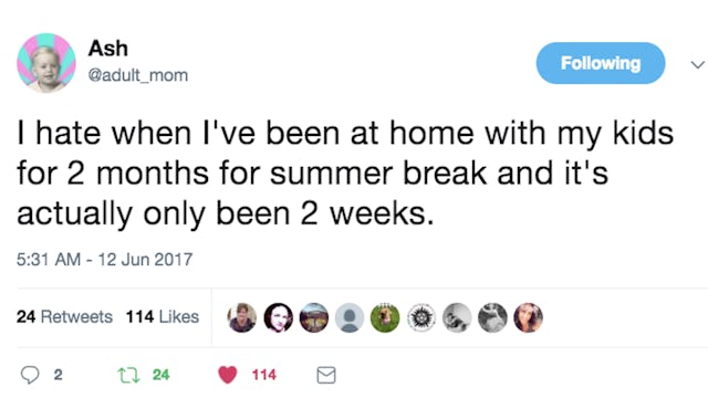 OK, to be fair, there’s some fun to be had and plenty of benefits. Nicer weather, no homework, no schedules, lots of easy hot dog dinners. But there’s also way more chances for sibling brawls, plenty of dawn wake-ups for no reason and all the whining for snacks and drinks that a little person can muster. Summer is a dream for kids, but can be a nightmare for parents. Luckily, we have the funny moms and dads of Twitter to make us laugh through those sunscreen-streaked tears.