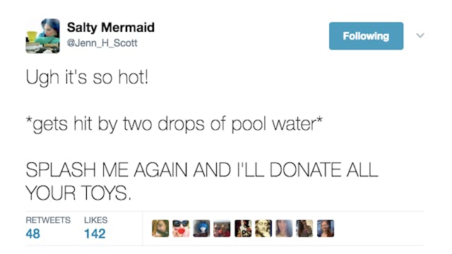 Be it pool or beach, there are few things fun about the swimming experience as a parent. Lay back and relax while the kids play? Hardly. Our entire job (when we’re not mediating fights over pool noodles or consoling a preschooler who lost their sand castle to low tide) is to keep them alive. We have to supervise every agonizing second and also, congratulate them on every lame handstand in the shallow end. It’s enough to make us wish it were September again (OK maybe not that desperate, talk to us again at the end of July) but luckily, the funny parents of Twitter totally get it.