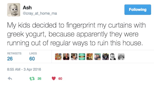 The funny parents of Twitter understand the frustration of every surface in your home being sticky and every item being perpetually at risk of destruction. Let them make you laugh as you survey the day’s damage. Welcome to parenting. Hope you enjoy cleaning.