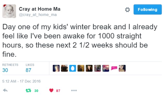 You start off positive — they have so many new toys, you think to yourself. How could they possibly get bored? This will be a breeze, right? Except it won’t. By December 27th, your kids will be all, “Hatchimal, who?” and you’ll be scrambling for ways to entertain them until school (blessedly) starts back up. It’s cold out, so going outside will be rough. Every indoor play-place near you will be a mob scene because, hello, everyone’s home from school. After a few days, you’ll resign yourself to providing your kids with a steady diet of Netflix and boxed mac and cheese. Because winter break is about survival. And no one knows the torture (or makes you laugh about it) like the funny parents of Twitter.