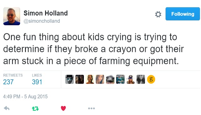 Whether it’s serving their breakfast on the “wrong” color plate (blasphemous), not letting them press the buttons on the elevator (how dare you!) or making them wear socks (surely there is no God!) kids have whining and crying on lock. Thankfully, the funny parents of Twitter have an endless supply of hilarious tweets about it so we can laugh. While our kids whine and cry.