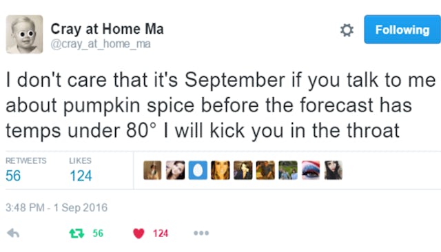 Everyone around you will want to throw pumpkin spice in your eye if you make them breathe in fall while they’re still in flip flops. Calm down. The time will come.