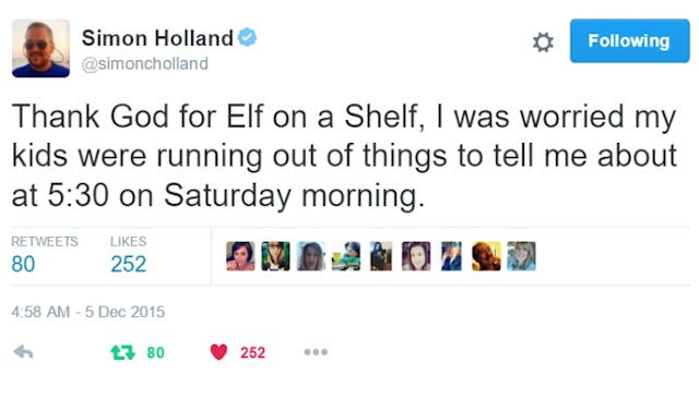 That’s right — it’s time to bust out the Elf on the Shelf. Sure, you can say it’s possible to keep your elf game pretty low maintenance, but kids talk. When your little Aiden hears that little Sophie’s elf came to town in a miniature and totally authentic Santa sleigh landing on a bed of snow made out of marshmallows, the pressure to compete can become intense. Make no mistake — this thing has the potential to be a giant pain in the ass and source of unending aggravation. And no one understands that pain like the funny parents of Twitter, so have a laugh at their hilarious thoughts on the beady-eyed little shit.