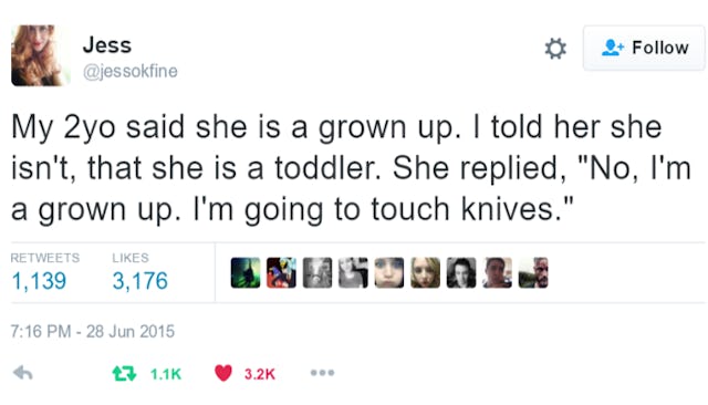 Mostly, the stuff kids say is funny and entertaining and in a way, it’s a pay-off for all the other indignities they force us parents to endure. For the low, low price of never sleeping again and having no disposable income, at least your kids will provide you with many laughs because of the never-ending stream of ridiculous shit they say. And of course, the funny parents of Twitter are letting everyone else in on the fun by tweeting their kids’ greatest hits. And for that, we are grateful.