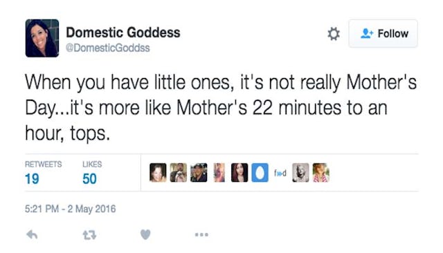 But realistically? Things will disappoint us and shit will go wrong. That’s why it’s a relief that the funny parents of Twitter can keep us laughing through the strife. Our husbands and kids might make us roll our eyes, but these hilarious tweets about Mother’s Day can turn those frowns upside down. So can mimosas.