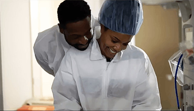 As the baby is born and held up by a doctor, Union-Wade holds her hands to her mouth, shaking and crying.