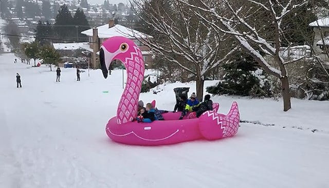 Seattle meteorologist Scott Sistek shared a video on his Facebook page of a bunch of kids having the absolute time of their lives while careening down a perfect sledding hill in a giant flamingo pool float. To be honest, I’m distraught this never occurred to me since I live in one of the tundra states and have been buried since early November. Making a mental note to hit up Amazon and use my Prime powers to get one ASAP, because look at how fun: