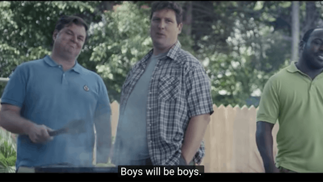 You know that moment in the Gillette anti toxic masculinity ad, where one boy is beating up another in front of a group of men around a grill and the man leans back, smiles, and says, “Boys will be boys”?