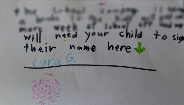 “the school company is taking a brake [sic] so the kids will get one more week of school off and we will need your child to sign their name here,” the letter reads. The girl had already dutifully signed her name, “Cara G.” on the line when she presented it to her mother.