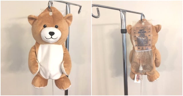 According to her website, the back of the Medi Teddy is mesh, “allowing for a doctor or nurse to see through and check on the fluid or medication a child is receiving. From the front, the child sees a friendly face and not the bag of medication, blood product or IV fluid being infused.”