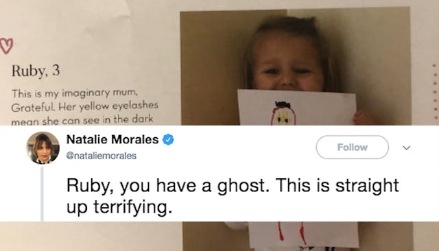 UK magazine Oh Comely asked kids to illustrate and write about the “companions” in their lives, namely their imaginary friends. So one little girl named Ruby decided to haunt our dreams with hers, who goes by the name “Grateful” and who visits her at night. Actress Natalie Morales tweeted the picture from the magazine and it understandably has people shook.