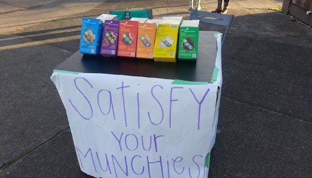 An anonymous Oregon Girl Scout recently spent an afternoon selling cookies from a table set up outside the Foster Buds Marijuana Dispensary in Portland, where she apparently raked in the dough. According to her aunt, they had a crowd at the table within minutes of setting up. The dispensary even got in on the act, offering a discount to customers who brought in a box of cookies they’d purchased from the girl’s table.