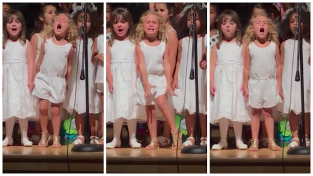 During her class’s rendition of the Oscar-nominated “How Far I’ll Go” from Moana, one adorable blonde girl put on a bigger star-making performance than The Rock himself. The fact that she’s not even tall enough to reach the microphone did not deter the little diva as she lost all inhibitions and belted out the song with her whole heart and soul.