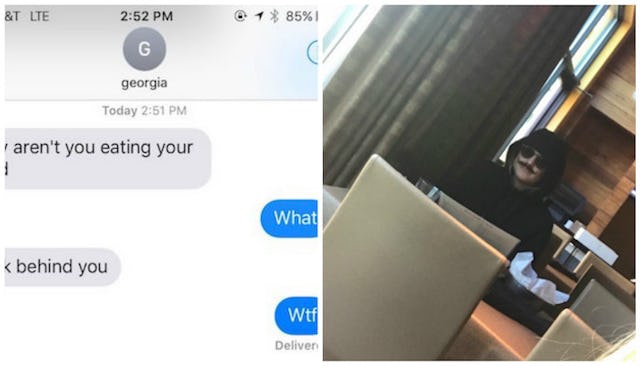 Dawsyn tweeted about Georgia’s hilarious (and heroic) BFF deed saying, “when your best friend wants to make sure your first date goes well,” complete with photos of her spy get-up and the creepy text she sent to alert Dawsyn of her presence. It’s since been retweeted over 200,000 times.