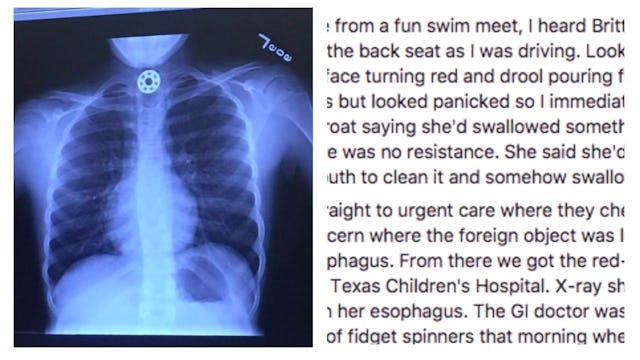 A piece of the fidget spinner got stuck in her daughter’s esophagus