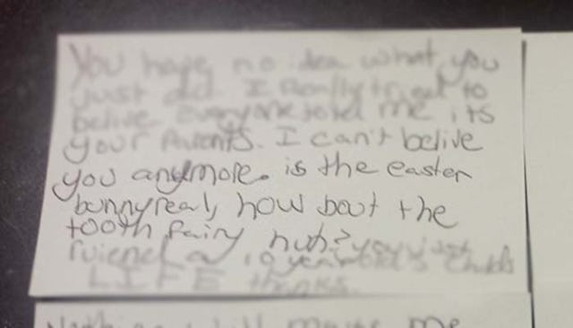 “You have no idea what you just did. I really tried to believe. Everyone told me it’s your parents. I can’t believe you anymore. Is the Easter bunny real? How about the tooth fairy, huh? You just ruined a 10-year-old child’s LIFE. Thanks.”