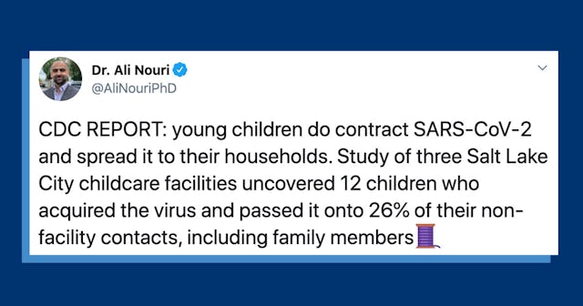 The study referenced in this tweet reported on twelve children who acquired COVID-19 in child care facilities. It reveals that the kids had mild or no symptoms, but that they did transmit the virus to at least 26% of the “non-facility contacts” (people outside the daycare) they came in contact with—one of whom was hospitalized.