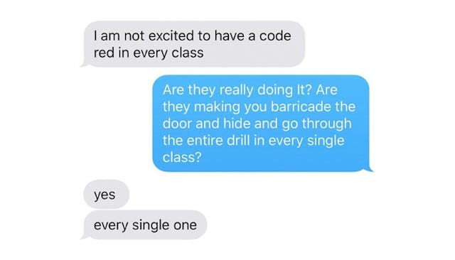 Doyle, who’s no stranger to mobilizing people in the name of causes that help children, shared the exchange between herself and her middle-school-aged daughter, who was texting her mom to let her know she had to endure “code red” drills at school all day that day. During every single class, she and her classmates were forced to barricade themselves in their classrooms and hide as part of the drill.