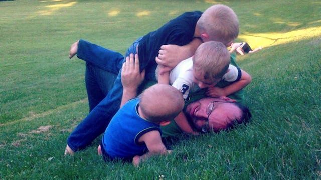 When he emerges from the 12-year-old’s bedroom, our 5-year-old pounces on him. “Daddy, can we play ‘horse scare?’” he pleads, referencing a game where they turn off the lights and Daddy gets on his hands and knees (even though after his knee reconstruction, it literally requires ibuprofen afterward) and they ride his back through the darkness. He groans good-naturedly and pulls our son toward him for a hug. “Turn off the lights, then,” he says. “Oh, and psst, did you know you’re my favorite? Don’t tell your brothers.”