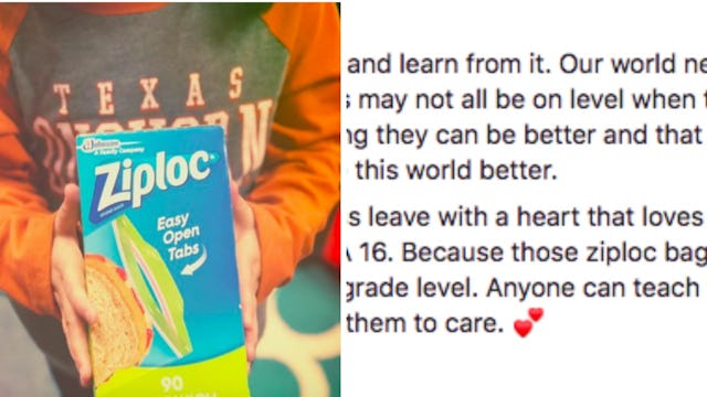 Then the student said the sweetest thing, “I heard you say you were out of Ziploc bags at home. I saw your sandwich and chips in the same bag. Nobody needs that. That’s gross. Plus, when we need something, you get it.”