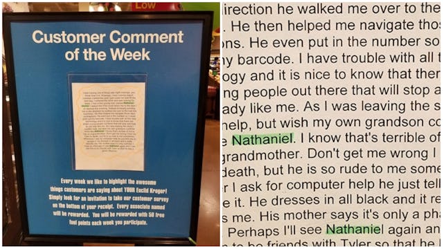 “As I was leaving the store I couldn’t help but wish my own grandson could be more like Nathaniel,” she wrote. “I know that’s terrible of me to say as a grandmother.” We kind of love how she brought up her grandma guilt on the comment card. If only her grandkid didn’t suck so much. “Don’t get me wrong I love my Tyler to death, but he is so rude to me sometimes,” she explained. “Whenever I ask for computer help he just tells me to google it.” To be fair, googling it is the easiest way to fix almost anything. But Tyler should know that grandmas aren’t tech savvy enough to navigate the scary google box on their own.