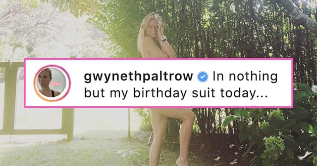 On Sunday, the actress and mom-of two stripped down to, well, nothing in honor of her 48th year on this planet. “In nothing but my birthday suit today,” she captioned the shot, giving props to her company Goop’s products for making her glow.