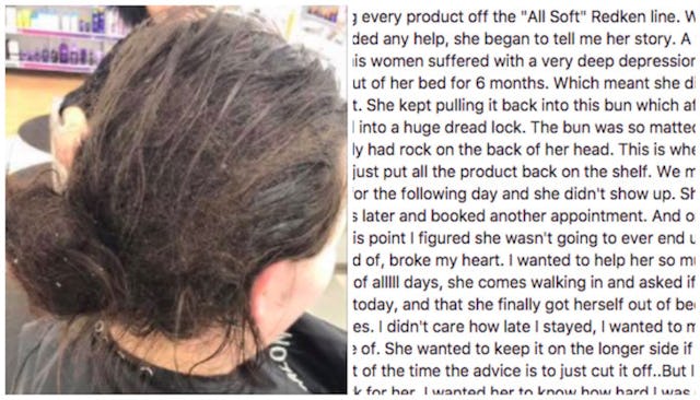 Hairstylist Kate Langman shared the story, keeping her client’s identity private. It was picked up by the Facebook page Love What Matters, where it quickly went viral. Langman explains that the woman came into The Salon inside Ulta, where she works as a stylist, to buy products to fix her damaged hair. Langman had a better idea.