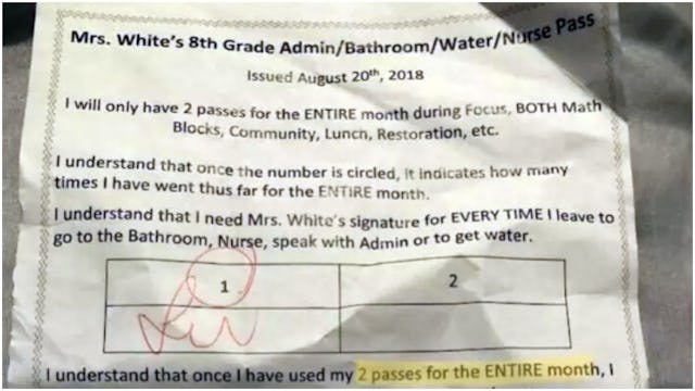 “I understand that once I have used my 2 passes for the ENTIRE month, I will not be able to go to the restroom, get water, or go [to] the nurse,” the policy read. “I understand that only special accommodations will be made if my Doctor writes a note regarding a medical condition.”