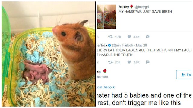 Felicity posted the picture on Twitter of proud mama hamster next to her young. And it was a sweet moment – for about a minute. Then shit got real quick when her followers started posting some little known facts about the animal kingdom: hamster cannibalism.