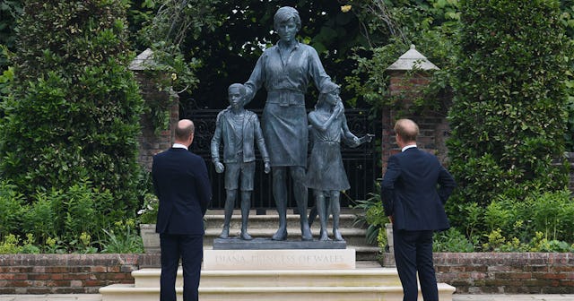 LONDON, ENGLAND – JULY 01: Prince William, Duke of Cambridge and Prince Harry, Duke of Sussex look at a statue they commissioned of their mother Diana, Princess of Wales, in the Sunken Garden at Kensington Palace, on what would have been her 60th birthday on July 1, 2021 in London, England. Today would have been the 60th birthday of Princess Diana, who died in 1997. At a ceremony here today, her sons Prince William and Prince Harry, the Duke of Cambridge and the Duke of Sussex respectively, will unveil a statue in her memory. (Photo by Dominic Lipinski – WPA Pool/Getty Images)