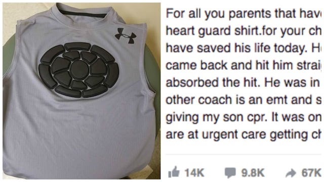 Commotio cordis is a condition that occurs when a person is hit in the chest with a blunt object, like a ball, with enough force to cause a disruption to the rhythm of their heart. Thankfully it’s not that common, with only 224 cases being reported in the U.S. since 1995. However, when it does happen, the fatality rate is about 65% in situations where there’s immediate CPR and/or a defibrillator present. Without such intervention, the fatality rate is over 80%. The condition most commonly happens during baseball games. Ryan’s heart guard shirt may have prevented the unthinkable from happening.