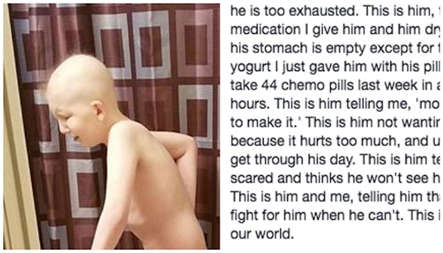 “This is having your son sleep with you at night because he is afraid of something happening and being alone, and by something I mean dying. This is having middle of the night conversations with a ten year old, asking if he dies will he go to heaven and will he see his dad there and be able to talk and play with him. This is him being too weak to get out of bed or walk and needing to be carried or in a wheelchair. This is him falling asleep as someone is talking to him, because he is too exhausted. This is him, throwing up every medication I give him and him dry heaving because his stomach is empty except for the spoonful of yogurt I just gave him with his pills. This is having to take 44 chemo pills last week in a matter of 24 hours. This is him telling me, “mommy, Im not going to make it.””