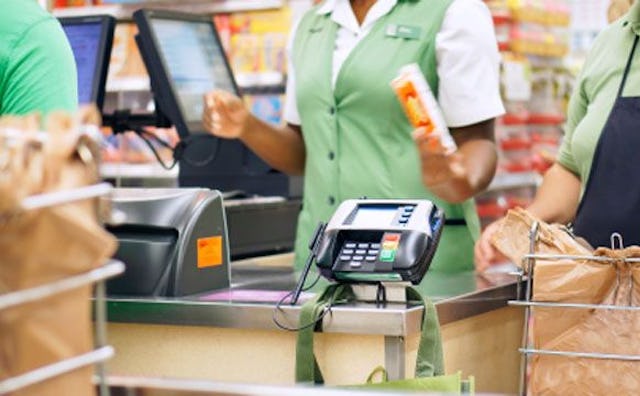 The cashier counted out his dollar bills and onlookers shifted to make room for his tilting tray. Someone picked up his change as it escaped his grasp, he muttered a thank you and continued on his way.