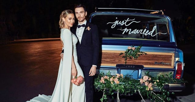 She kept her caption game simple writing only, “This” alongside the photo of the newlyweds in their wedding attire, standing next to a vintage car with “just married” written on the window. Awwww.
