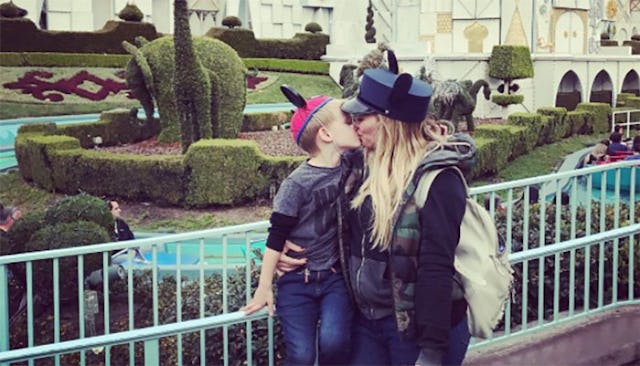 Hilary Duff took her son to Disneyland this week, and shared a photo of their day. It’s a sweet snap of her and her four-year-old kissing in front of the It’s a Small World ride.
