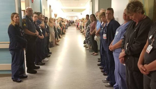 Carrie called 911 and performed chest compressions but after two days in the hospital, her husband was declared brain dead. Clete was an organ donor so this meant Carrie was left with a decision to make — and that decision ultimately saved three lives through organ donation (his kidneys and liver) and touched a total of 50 people in need. On the way to the operating room, Carrie was able to capture the incredible moment when over 150 hospital staff, nurses, family, and friends lined the hallway for an “honor walk” to pay their respects to a man about to save so many lives.