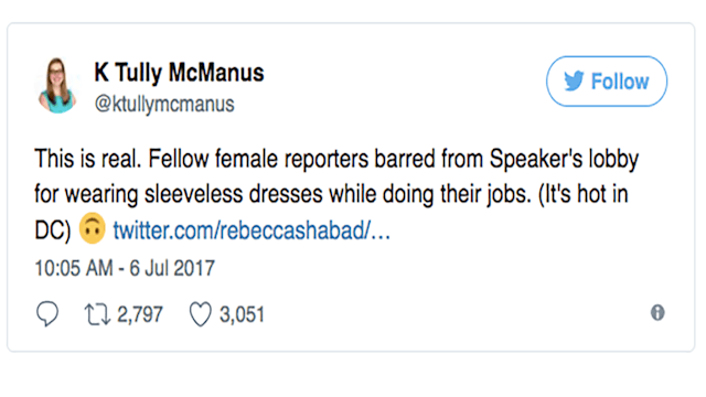 While this dress code is apparently nothing new, K Tully McManus went on to tweet that “issues arise annually as D.C. heats up each spring/summer.” While these rules also aren’t something Republicans made up, Paul Ryan is our Republican Speaker of the House, and this dress code is ultimately left to his discretion.