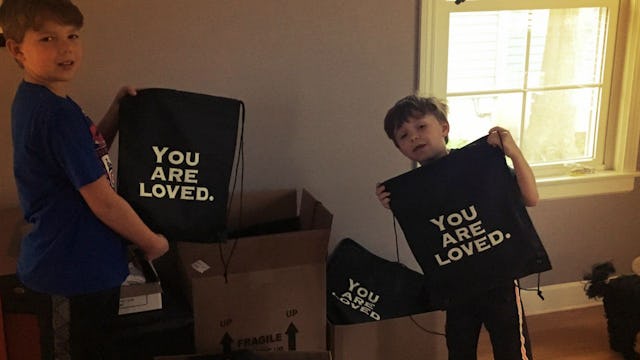 We talked some more about his idea, and what it might look like. His vision was to create backpacks filled with essentials like water, socks, toothpaste/toothbrush, and granola bars. I suggested maybe adding a note with information on shelters in the area. He made a handwritten card to go in each of the bags. I ordered backpacks online with the words “you are loved” printed on the outside and bought supplies in bulk (thanks, Amazon!).