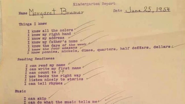 From the looks of it, Margaret Bramer’s kindergarten class was a whole lot different than kindergarten is today. Academically, the things the children were expected to master were pretty basic, like color recognition, being able to read and write their first name, knowing their address, knowing the days of the week, and counting out loud. (Although it is the ultimate hallmark of 1950s patriarchy that the kids are expected to know their father’s first name, and not their mother’s. But we already knew that the ’50s majorly sucked in that regard.)